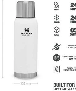 Die aus rostfreiem Edelstahl gefertigte Stanley ADVENTURE VAKUUM-FLASCHE ist mit einer schützenden, matt weißen Lackierung versehen. Die doppelwandige Vakuum-Isolation hält Getränke bis zu 24 Stunden heiß oder kalt. Über dem Flaschenverschluss sitzt ein Trinkbecher, der ebenfalls isolierend ausgelegt ist. Durch die 5 cm weite Öffnung lässt sich die Flasche sehr gut reinigen. Fassungsvermögen: 1 Liter.