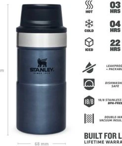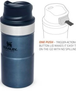 Mit der Slim Line Version des TRIGGER-ACTION TRAVEL MUG führt Stanley eine überarbeitete Version der einhändig bedienbaren Becher ein. Durch das neue, schlankere Design liegt der Becher noch angenehmer in der Hand und die 250ml-Variante passt unter die meisten Kaffee-Automaten. Das Drücken der großen und sehr leichtgängigen Taste zum Aktivieren der Trinköffnung mit einer Hand macht Trinken – on the go – zum Vergnügen. Der Trinkbecher in nightfall-blue aus rostfreiem 18/8-Edelstahl mit Vakuumisolierung besitzt ein Fassungsvermögen von 250 ml und hält Getränke bis zu 3 Stunden heiß oder 4 Stunden gekühlt. Der TRIGGER-ACTION TRAVEL MUG ist komplett spülmaschinenfest, auslaufsicher und passt in gängige PKW-Getränkehalter. BPA-frei.