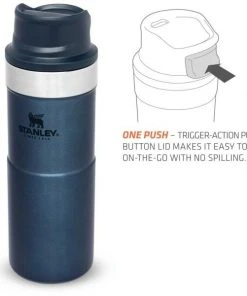 Mit der Slim Line Version des TRIGGER-ACTION TRAVEL MUG führt Stanley eine überarbeitete Version der einhändig bedienbaren Becher ein. Durch das neue, schlankere Design liegt der Becher noch angenehmer in der Hand und passt in alle gängige PKW-Getränkehalter. Das Drücken der großen und sehr leichtgängigen Taste zum Aktivieren der Trinköffnung mit einer Hand macht Trinken – on the go – zum Vergnügen. Der Trinkbecher in nightfall-blue aus rostfreiem 18/8-Edelstahl mit Vakuumisolierung besitzt ein Fassungsvermögen von 354 ml und hält Getränke bis zu 5 Stunden heiß oder 6 Stunden gekühlt. Der TRIGGER-ACTION TRAVEL MUG ist komplett spülmaschinenfest und auslaufsicher. BPA-frei.