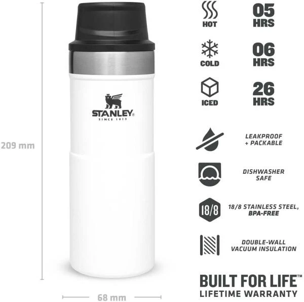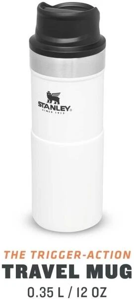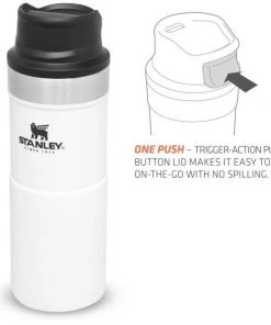 Mit der Slim Line Version des TRIGGER-ACTION TRAVEL MUG führt Stanley eine überarbeitete Version der einhändig bedienbaren Becher ein. Durch das neue, schlankere Design liegt der Becher noch angenehmer in der Hand und passt in alle gängige PKW-Getränkehalter. Das Drücken der großen und sehr leichtgängigen Taste zum Aktivieren der Trinköffnung mit einer Hand macht Trinken – on the go – zum Vergnügen. Der polarweisse Trinkbecher aus rostfreiem 18/8-Edelstahl mit Vakuumisolierung besitzt ein Fassungsvermögen von 354 ml und hält Getränke bis zu 5 Stunden heiß oder 6 Stunden gekühlt. Der TRIGGER-ACTION TRAVEL MUG ist komplett spülmaschinenfest und auslaufsicher. BPA-frei.