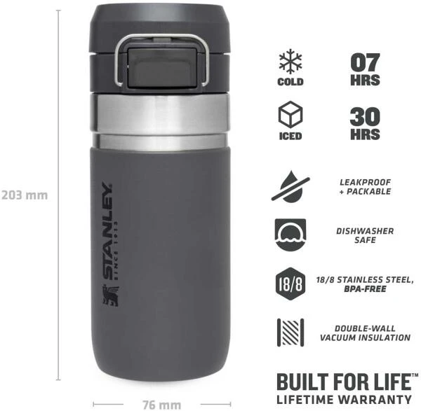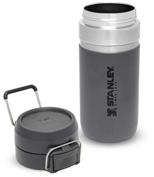 Ob für die Outdoor-Tour, den Sport oder einfach On The Road, die Stanley QUICK-FLIP WATER BOTTLE ist der ideale Begleiter gegen den Durst. Die auslaufsichere Flasche ist mit einem innovativen, zweistufigen Sicherheitsverschluss ausgestattet. Beim Transport wird der Verschluss gegen unbeabsichtigtes Öffnen von einem Edelstahlbügel fixiert. Wird dieser gelöst und der Push-Button Knopf gedrückt, flippt der Deckel federunterstützt auf. Die Trinkflasche aus rostfreiem 18/8-Edelstahl mit Vakuumisolierung besitzt ein Fassungsvermögen von 473 ml und hält Getränke bis zu 5 Stunden heiß oder 7 Stunden gekühlt. Die Flasche passt in gängige PKW-Getränkehalter und ist mit einem beweglichen Bügel zum Anhängen an den Rucksack oder Tragegriff ausgestattet. Alle Teile können in der Spülmaschine gereinigt werden. BPA-frei.