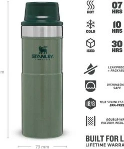 Mit dem Stanley CLASSIC TRIGGER-ACTION TRAVEL MUG in Hammertone Green führt Stanley eine neue Generation der Becher mit Einhandbedienung ein. Das Drücken der großen und sehr leichtgängigen Taste zum Aktivieren der Trinköffnung mit einer Hand macht Trinken – on the go – zum Vergnügen. Der Trinkbecher aus rostfreiem 18/8-Edelstahl mit Vakuumisolierung besitzt ein Fassungsvermögen von 473 ml und hält Getränke bis zu 7 Stunden heiß oder sogar 10 Stunden gekühlt. Der TRIGGER-ACTION TRAVEL MUG ist komplett spülmaschinenfest, auslaufsicher und passt in gängige PKW-Getränkehalterungen. BPA-frei.