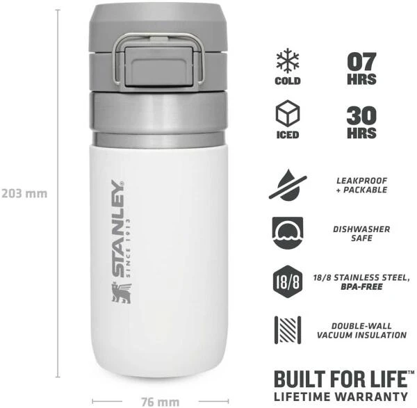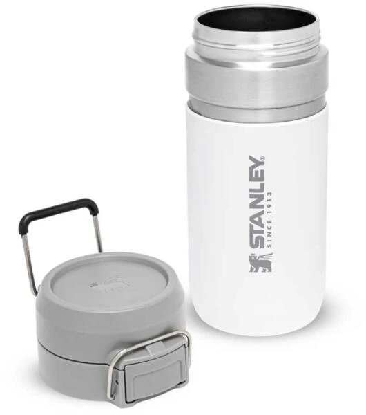 Ob für die Outdoor-Tour, den Sport oder einfach On The Road, die Stanley QUICK-FLIP WATER BOTTLE ist der ideale Begleiter gegen den Durst. Die auslaufsichere Flasche ist mit einem innovativen, zweistufigen Sicherheitsverschluss ausgestattet. Beim Transport wird der Verschluss gegen unbeabsichtigtes Öffnen von einem Edelstahlbügel fixiert. Wird dieser gelöst und der Push-Button Knopf gedrückt, flippt der Deckel federunterstützt auf. Die Trinkflasche aus rostfreiem 18/8-Edelstahl mit Vakuumisolierung besitzt ein Fassungsvermögen von 473 ml und hält Getränke bis zu 5 Stunden heiß oder 7 Stunden gekühlt. Die Flasche passt in gängige PKW-Getränkehalter und ist mit einem beweglichen Bügel zum Anhängen an den Rucksack oder Tragegriff ausgestattet. Alle Teile können in der Spülmaschine gereinigt werden. BPA-frei.