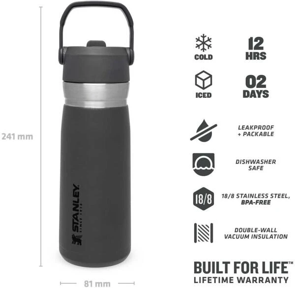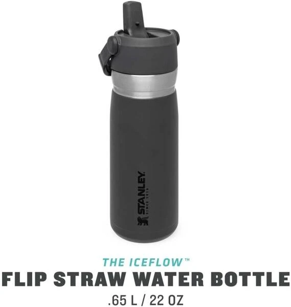 Die Stanley ICEFLOW FLIP STRAW WATER BOTTLE ist die perfekte Wahl für kalte Getränke beim Sport, in der Natur oder einfach beim Unterwegs sein. Das ausklappbare Mundstück – gleichzeitig Verschluss der Flasche – ist im inneren mit einem Kunststoff-Trinkhalm ausgestattet, wodurch die Flasche beim Trinken nicht gekippt werden muss. Zum einfachen Transportieren ist der Deckel mit einem praktischen, beweglichen Tragegriff ausgestattet. Die Trinkflasche aus rostfreiem 18/8-Edelstahl mit Vakuumisolierung besitzt ein Fassungsvermögen von 650 ml und hält Getränke bis zu 12 Stunden gekühlt. Die ICEFLOW FLIP STRAW WATER BOTTLE ist komplett spülmaschinenfest und auslaufsicher. BPA-frei.