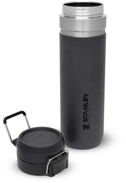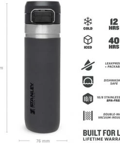 Ob für die Outdoor-Tour, den Sport oder einfach On The Road, die Stanley QUICK-FLIP WATER BOTTLE ist der ideale Begleiter gegen den Durst. Die auslaufsichere Flasche ist mit einem innovativen, zweistufigen Sicherheitsverschluss ausgestattet. Beim Transport wird der Verschluss gegen unbeabsichtigtes Öffnen von einem Edelstahlbügel fixiert. Wird dieser gelöst und der Push-Button Knopf gedrückt, flippt der Deckel federunterstützt auf. Die Trinkflasche aus rostfreiem 18/8-Edelstahl mit Vakuumisolierung besitzt ein Fassungsvermögen von 709 ml und hält Getränke bis zu 8 Stunden heiß oder 12 Stunden gekühlt. Die Flasche passt in gängige PKW-Getränkehalter und ist mit einem beweglichen Bügel zum Anhängen an den Rucksack oder Tragegriff ausgestattet. Alle Teile können in der Spülmaschine gereinigt werden. BPA-frei.