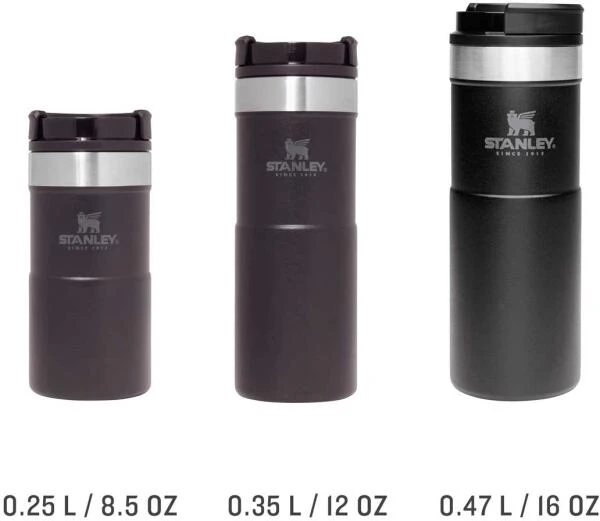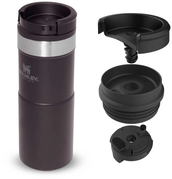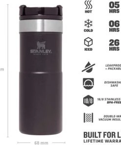 Mit dem Stanley NEVERLEAK TRAVEL MUG werden durch seine doppelwandige Edelstahl-Vakuumisolierung heiße Getränke bis zu 5 Stunden heiß und kalte Getränke bis zu 6 Stunden kalt gehalten. Der Trinkbecher aus rostfreiem 18/8-Edelstahl besitzt ein Fassungsvermögen von 354 ml und verfügt über einen einzigartigen 3-Positionen Deckel, der sich zum einfachen Trinken aufdrehen lässt und beim Schließen fest verriegelt. Der NEVERLEAK TRAVEL MUG ist komplett spülmaschinenfest, auslaufsicher und passt in gängige PKW-Getränkehalterungen. BPA-frei.