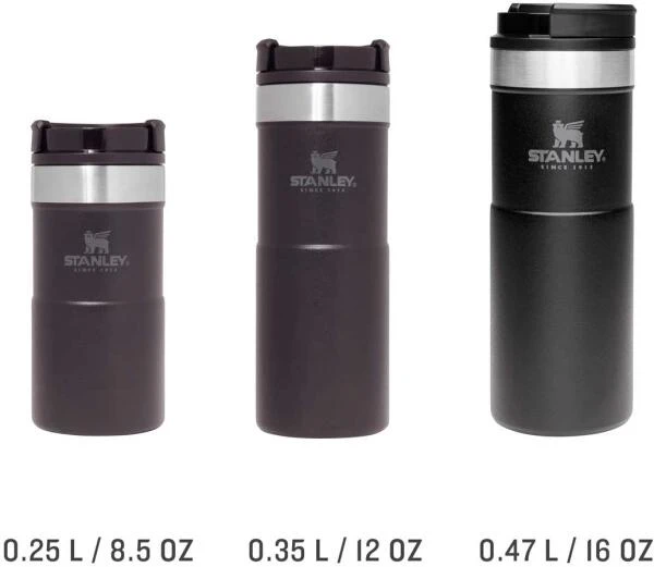 Mit dem Stanley NEVERLEAK TRAVEL MUG werden durch seine doppelwandige Edelstahl-Vakuumisolierung heiße Getränke bis zu 7 Stunden heiß und kalte Getränke bis zu 10 Stunden kalt gehalten. Der Trinkbecher aus rostfreiem 18/8-Edelstahl besitzt ein Fassungsvermögen von 473 ml und verfügt über einen einzigartigen 3-Positionen Deckel, der sich zum einfachen Trinken aufdrehen lässt und beim Schließen fest verriegelt. Der NEVERLEAK TRAVEL MUG ist komplett spülmaschinenfest, auslaufsicher und passt in gängige PKW-Getränkehalterungen. BPA-frei.
